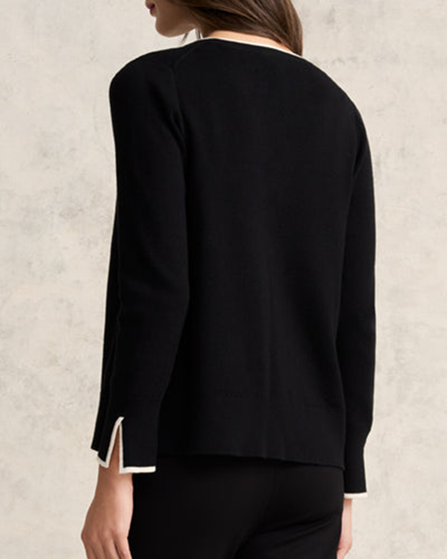 - Contrast tipping at neck, centre seam and cuff