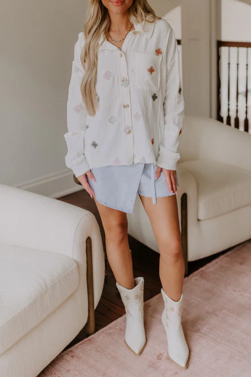This jacket is the cutest way to upgrade your outfit! The playful embroidery adds the perfect stylish twist. - Unlined materials featuring subtly textured material as well as waffle knit material - Abstract floral embroidery featuring gold, lavender, black, and a blue hue - A collared neckline with a hooded back featuring a functional drawstring - A buttoned front - Long sleeves - Unfinished seam accents - A functional chest pocket - A relaxed silhouette that ends in an unfinished hemline with side slit accents