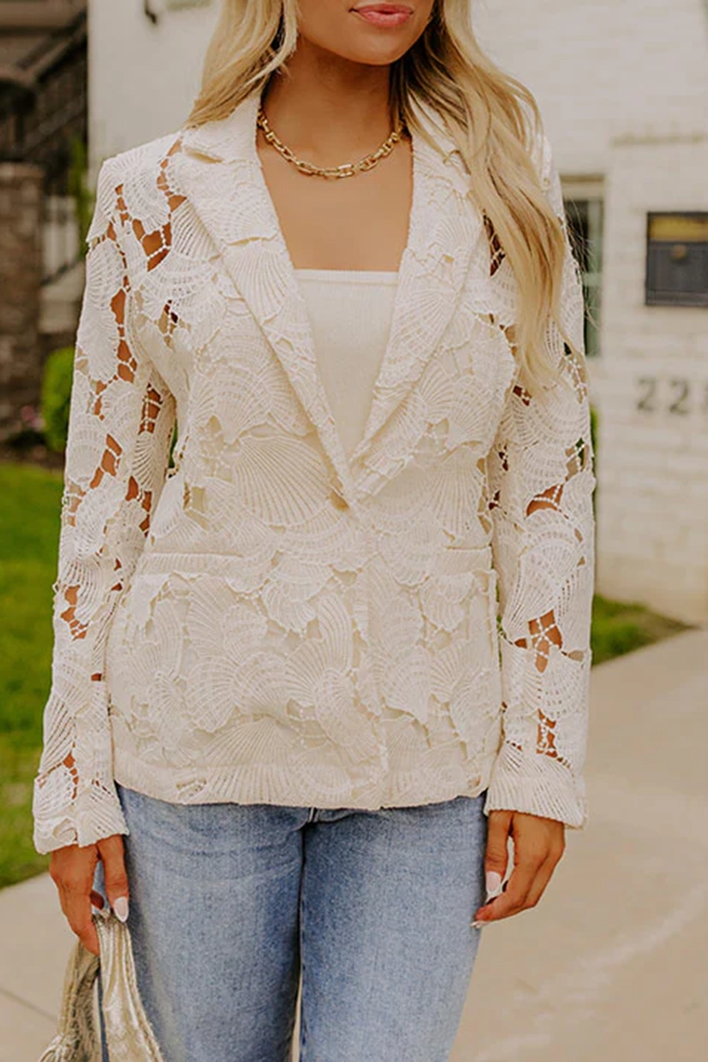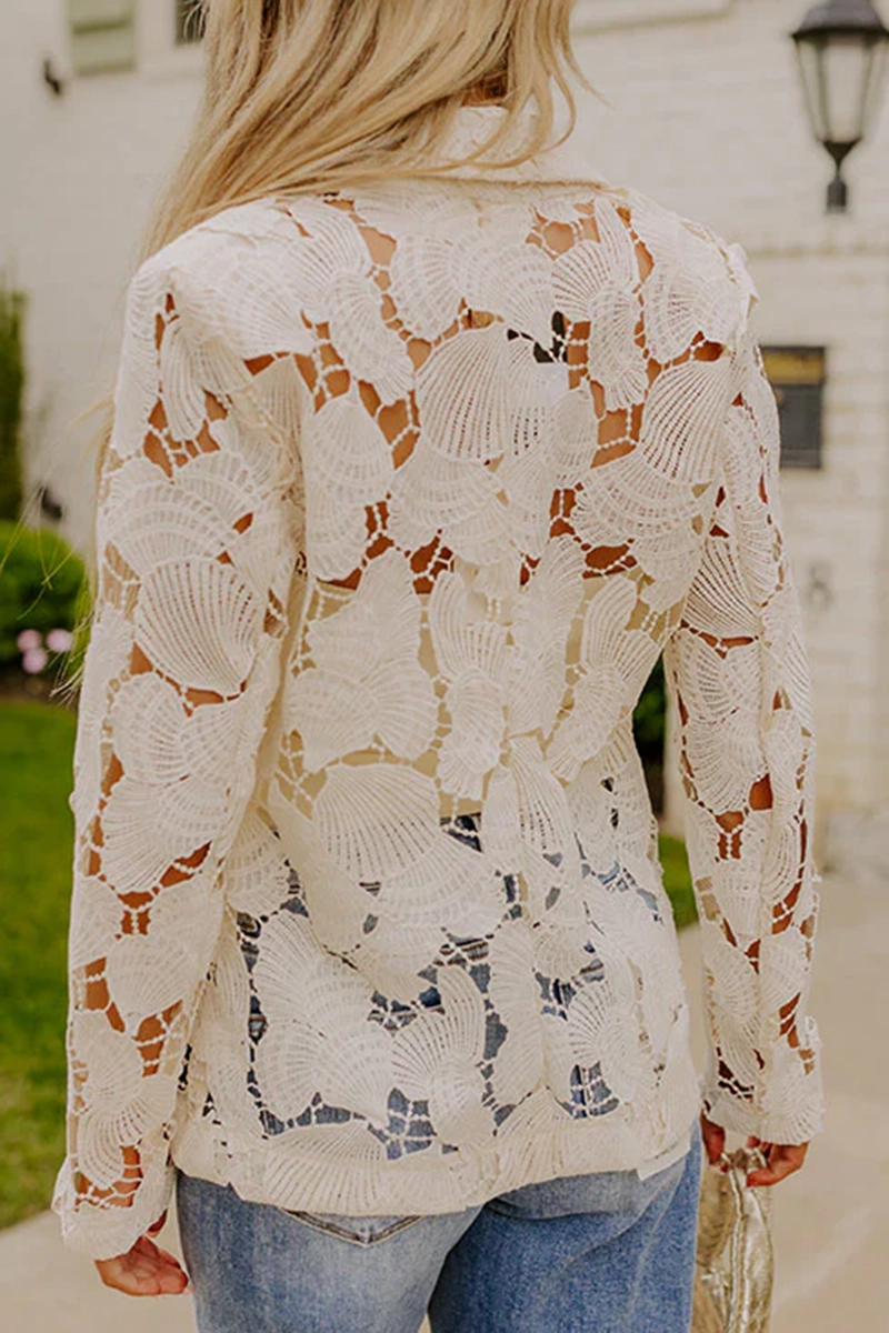 - This blazer is giving beachy bliss! The seashell-inspired crochet lace adds a playful twist, making it a standout pick for getaway moments and breezy days. - Unlined crochet lace material with a seashell design - A collared v-cut neckline - Long sleeves - Built-in shoulder pads - A single gold colored shell shaped button - Faux pocket cut accents on the front - A relaxed silhouette that ends in a straight hemline