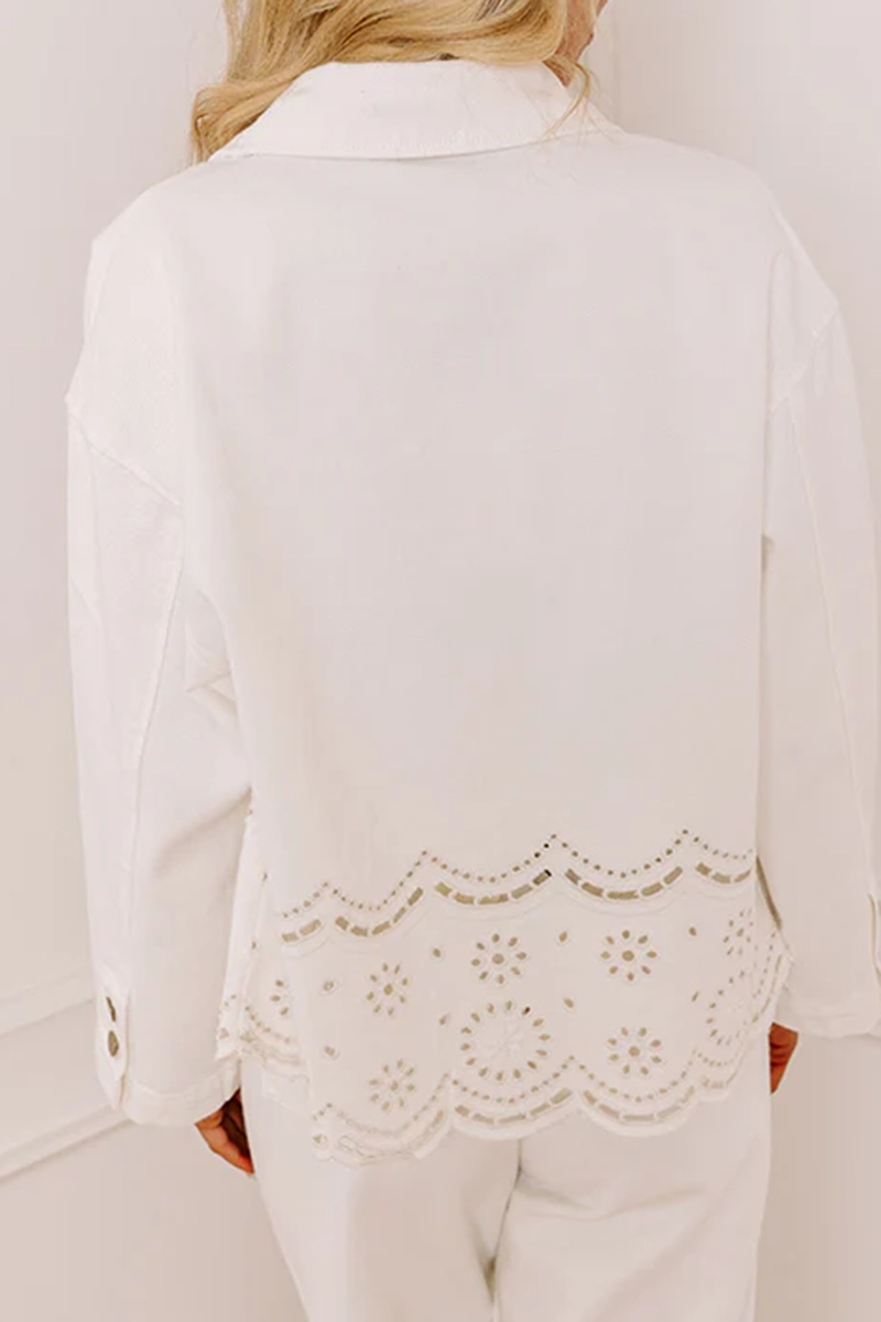 Bring a touch of charm to your look with this adorable jacket! The eyelet design adds a cute twist to casual style, making it the perfect piece for breezy days. - Unlined denim material with eyelet accents - A collared neckline - Long sleeves with buttoned cuffs - A buttoned front - Functional front pockets - A relaxed silhouette that ends in a scalloped hemline