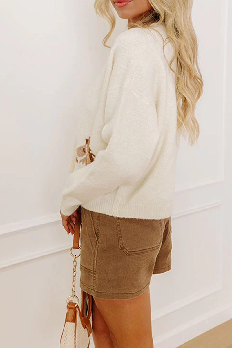 How adorable is this trendy knit top? The charming horse design is just too cute to resist! Add a playful touch to your OOTD with this daring piece! - Unlined knit material - Two brown hued horses knit on the front - A crew cut neckline - A buttoned front - Long sleeves with ribbed cuffs - A relaxed silhouette that ends in a ribbed hemline